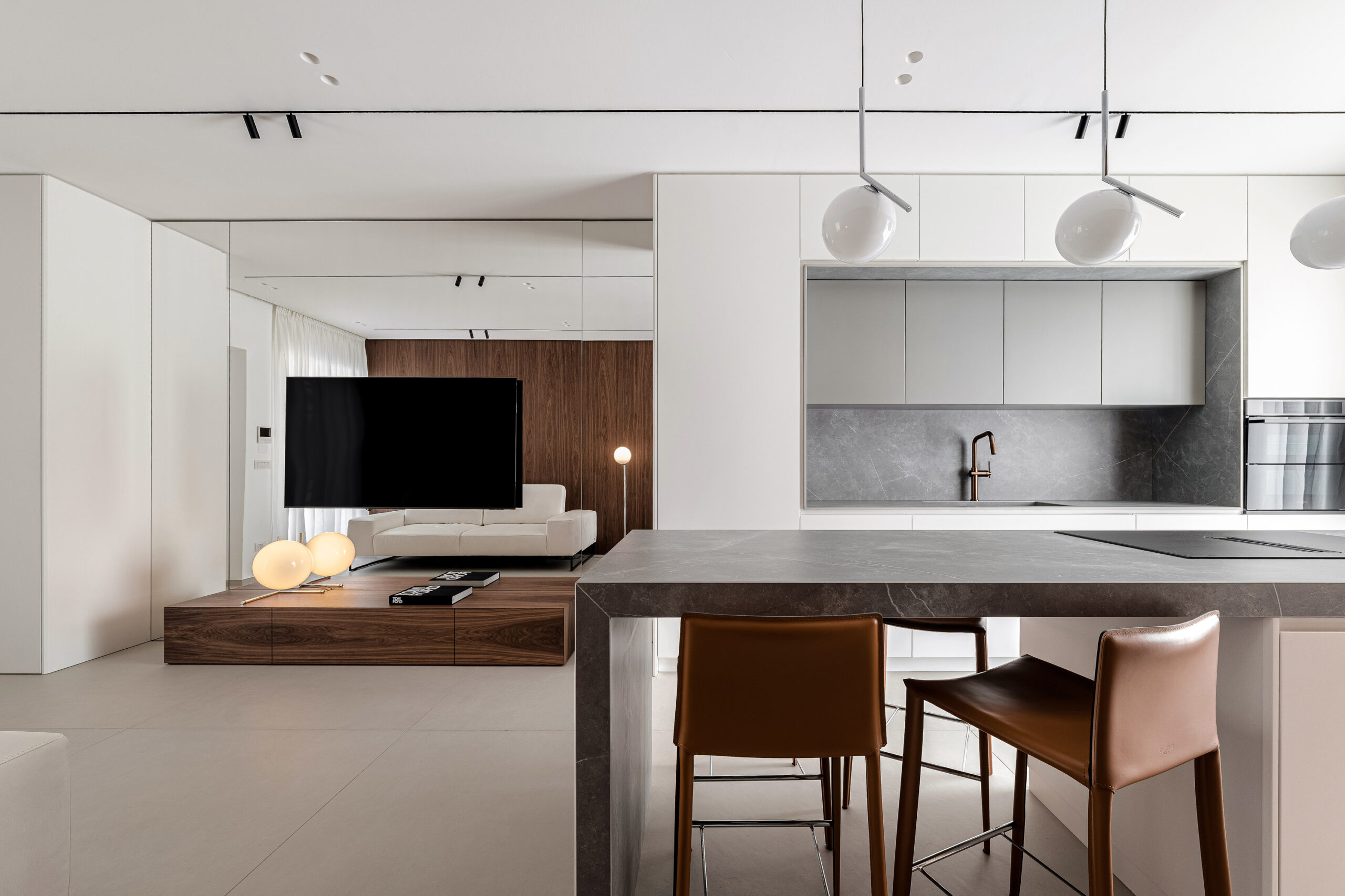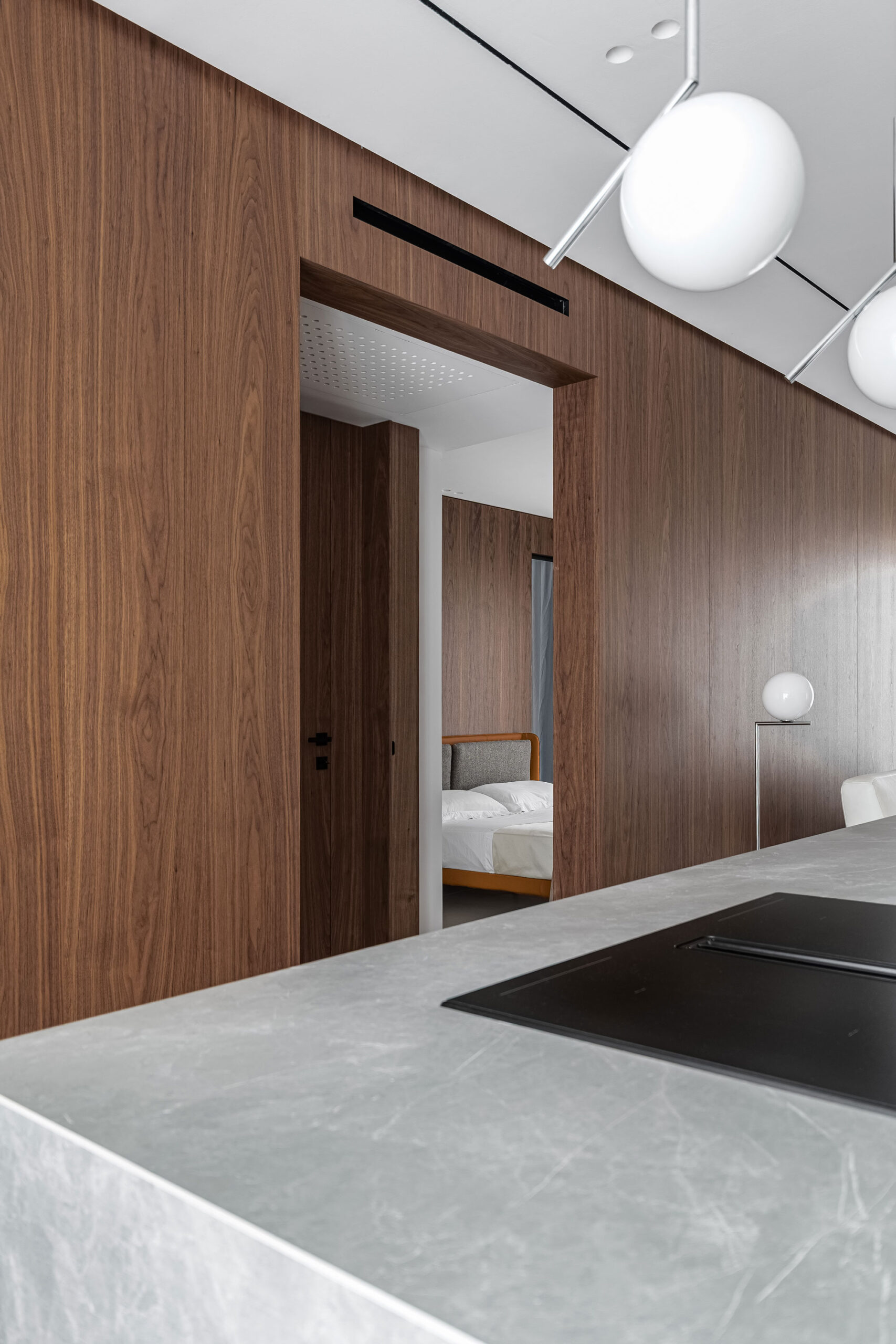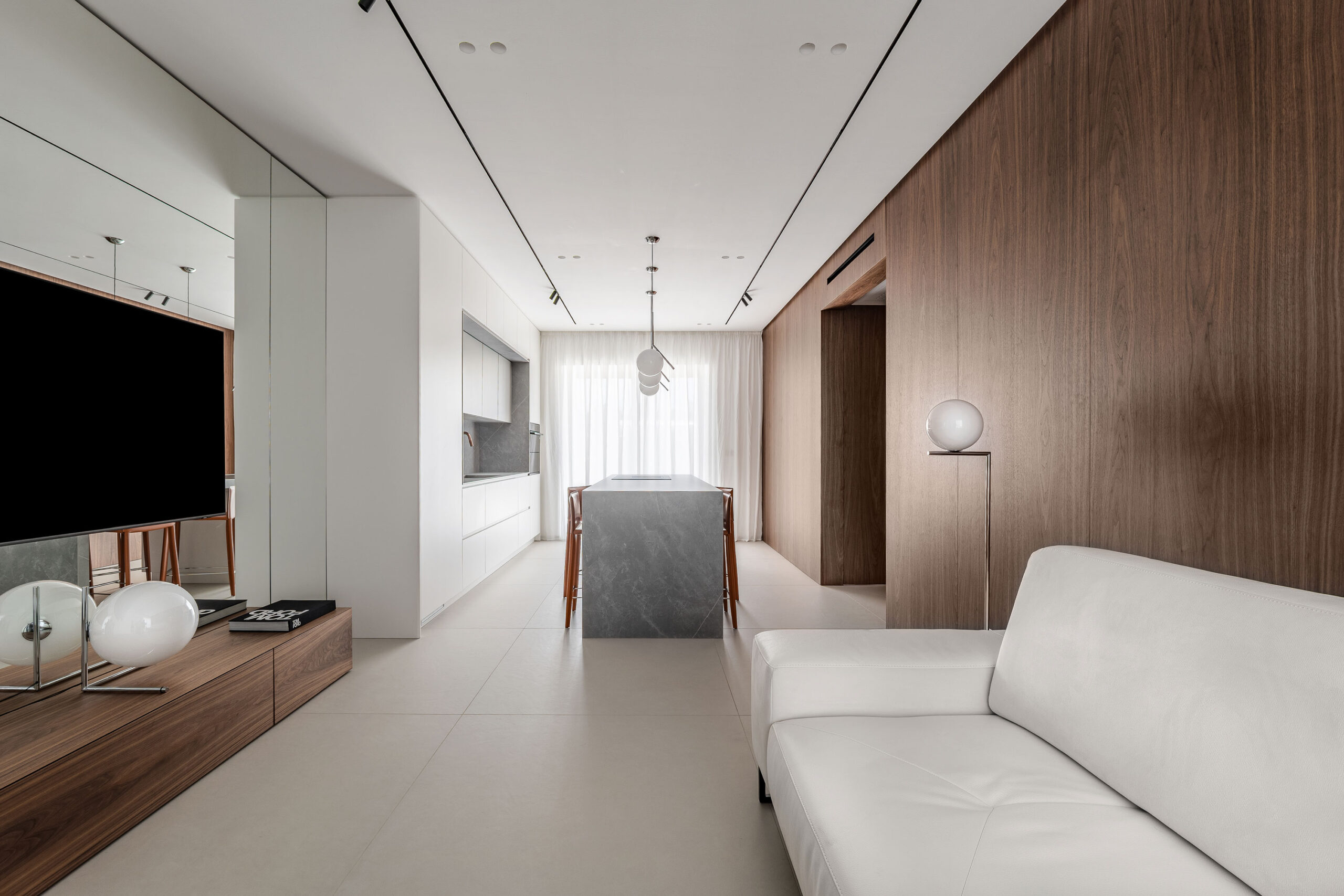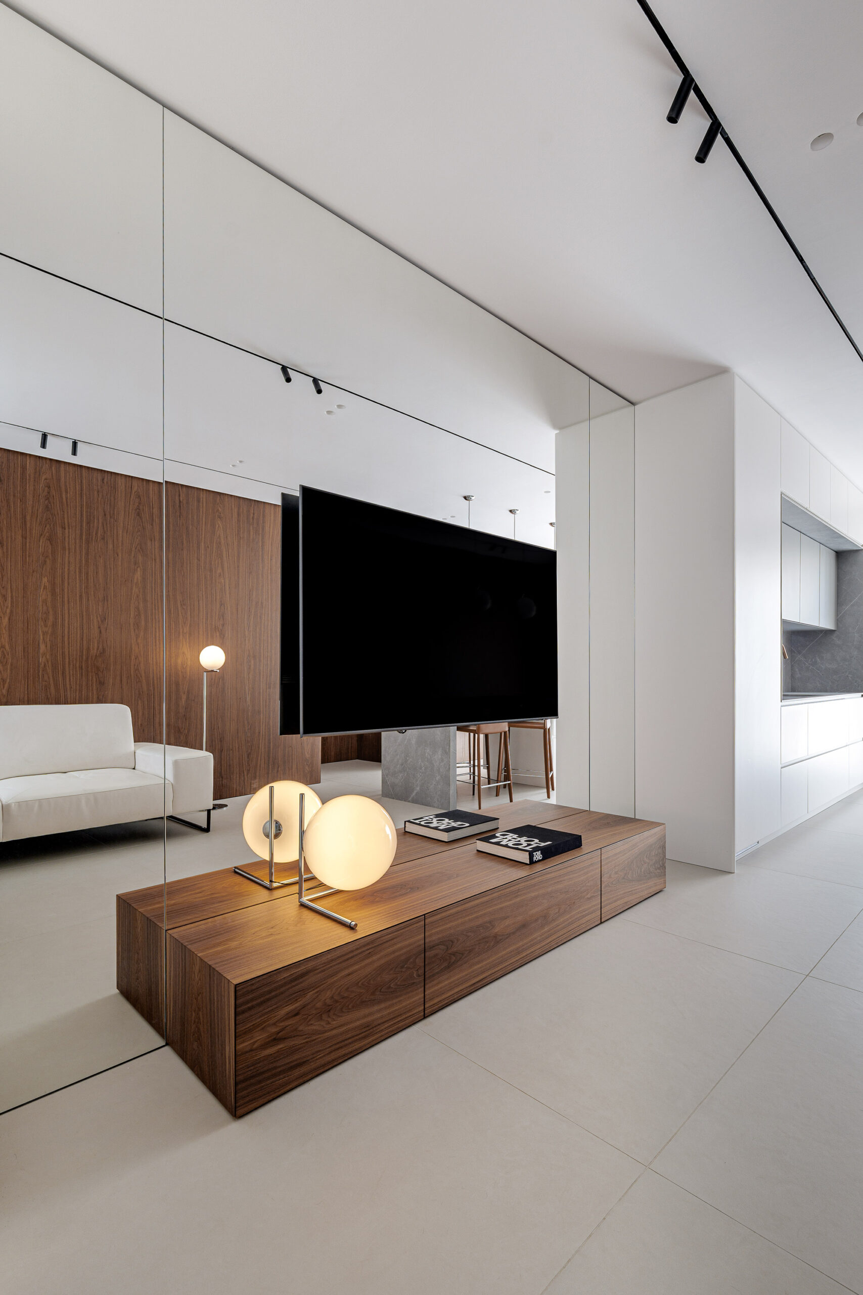 This project is based on a warm palette with shades reminiscent of earth tones: dark wood, beige, leather, and light gray stone. Design elements like mirrors are used to add a touch of luxury and depth to the space, while wooden panels not only add warmth but also serve as intelligent and decorative dividers that encompass all rooms of the apartment. This mix of materials and meticulously planned measures to create a cozy and sophisticated environment.