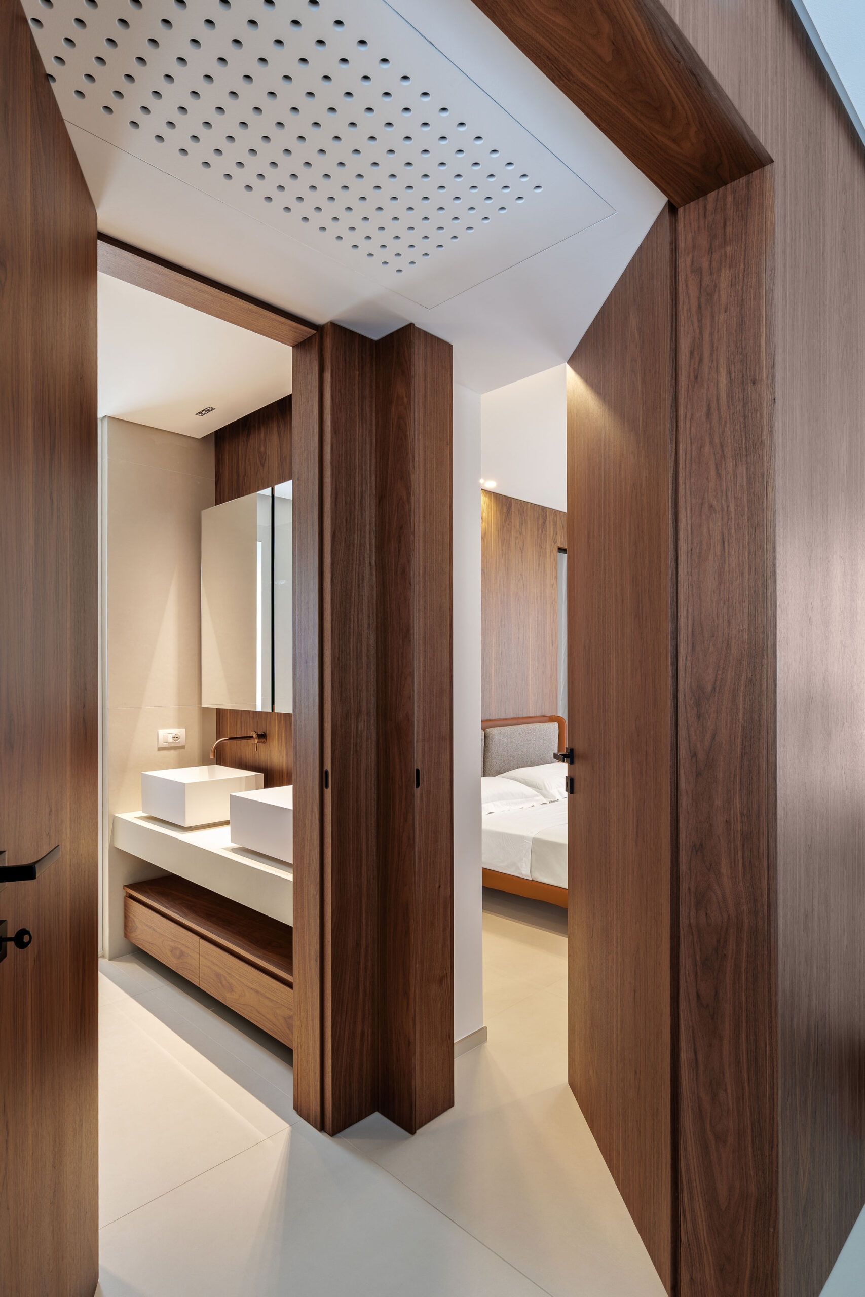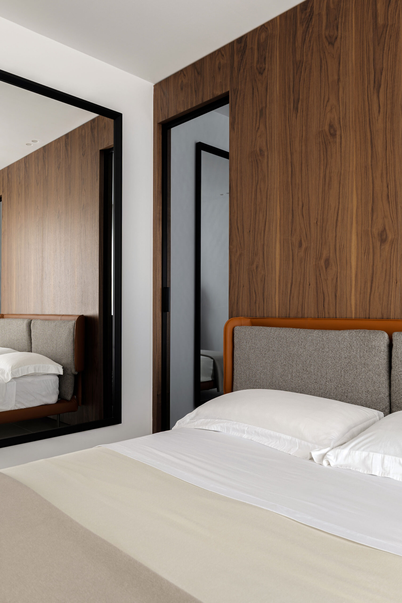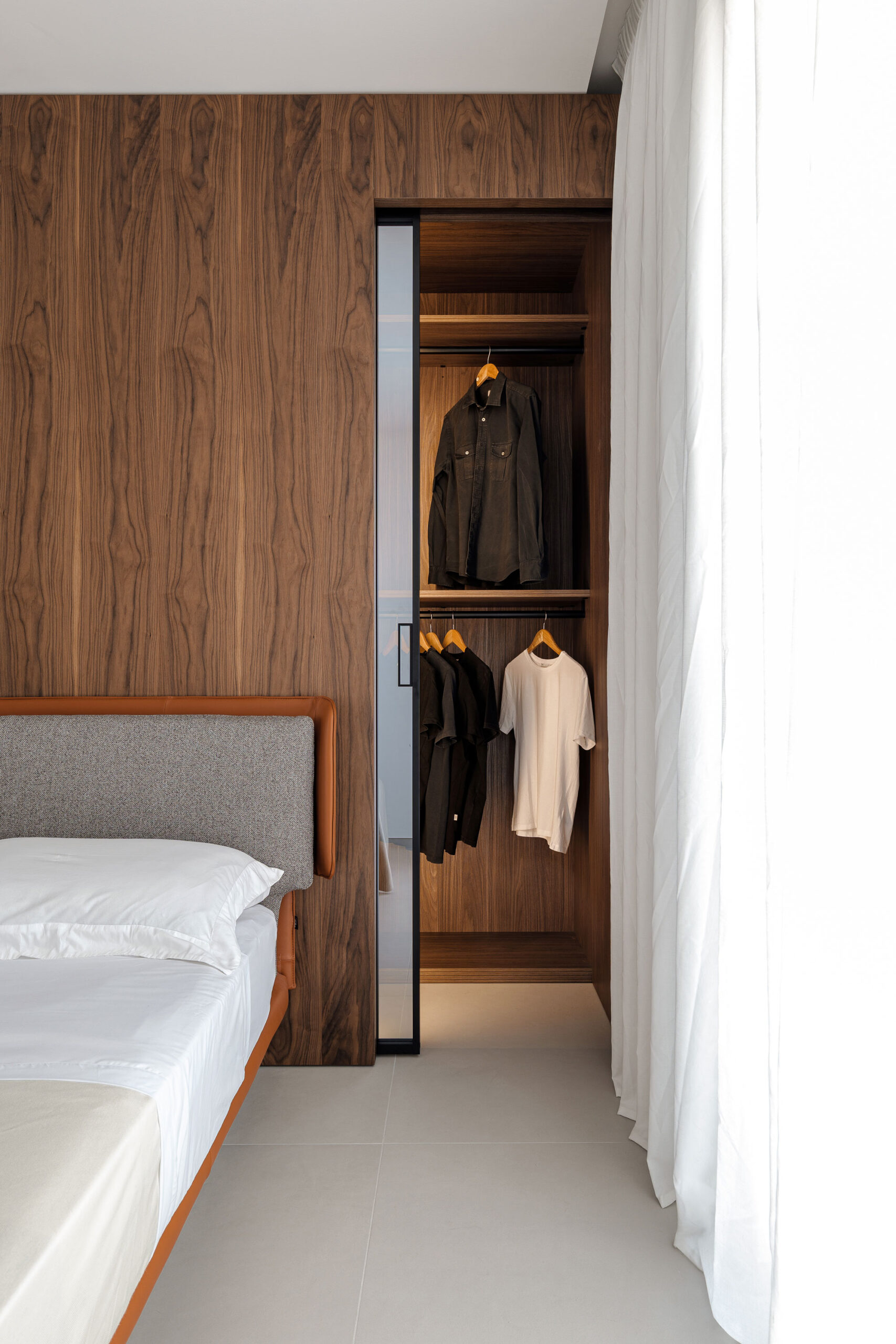 This project is based on a warm palette with shades reminiscent of earth tones: dark wood, beige, leather, and light gray stone. Design elements like mirrors are used to add a touch of luxury and depth to the space, while wooden panels not only add warmth but also serve as intelligent and decorative dividers that encompass all rooms of the apartment. This mix of materials and meticulously planned measures to create a cozy and sophisticated environment.