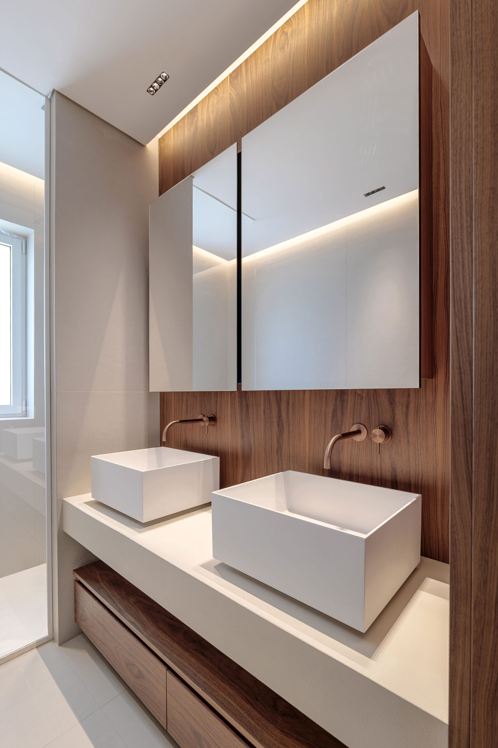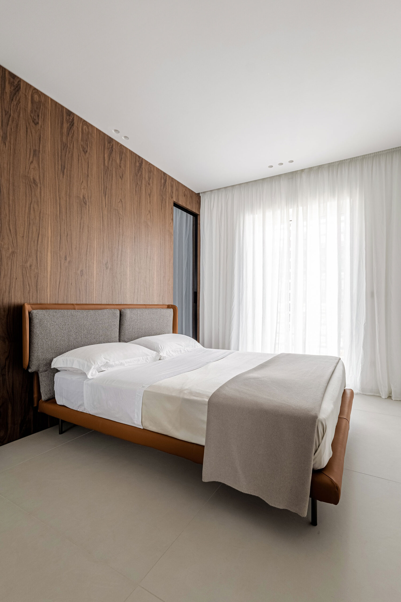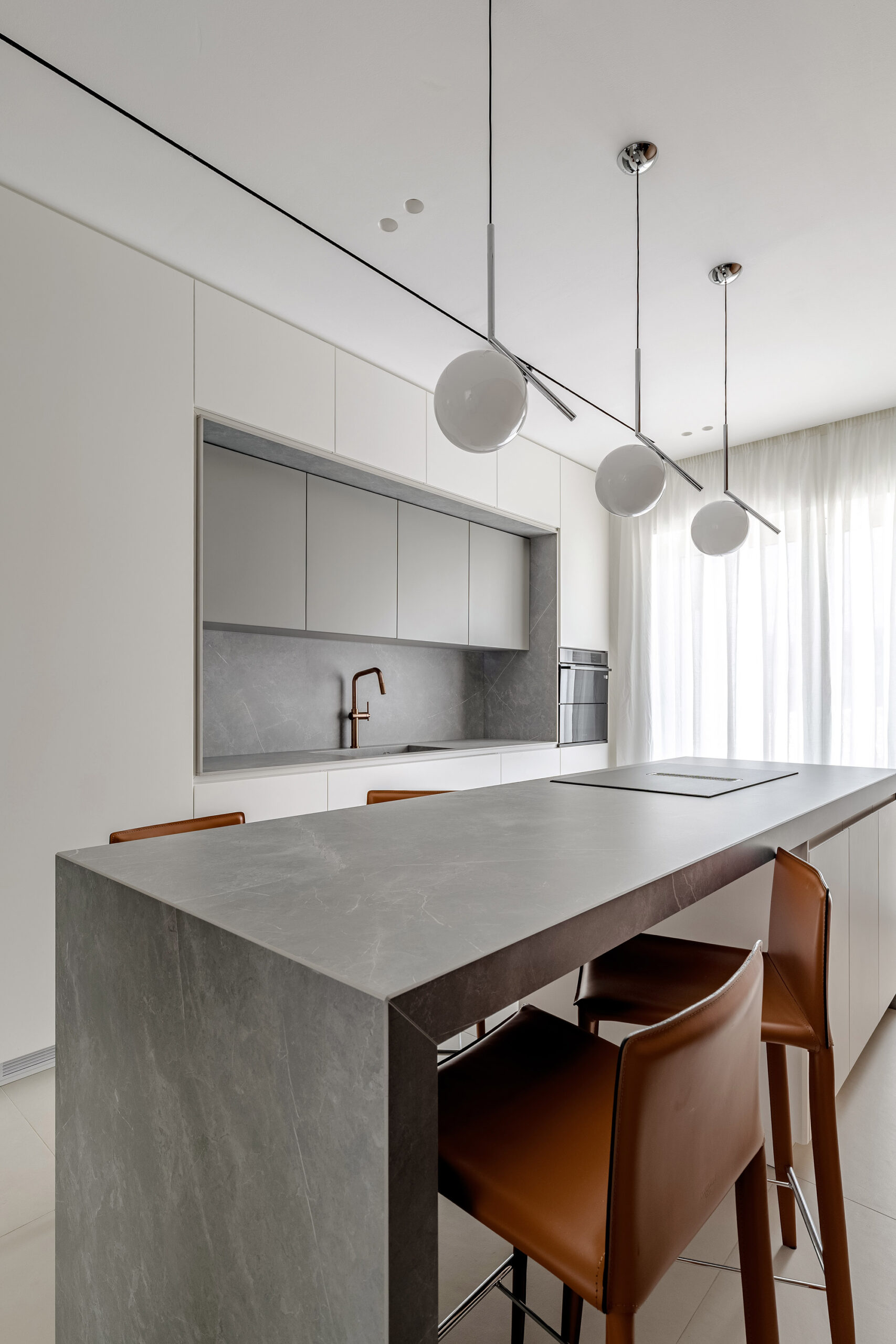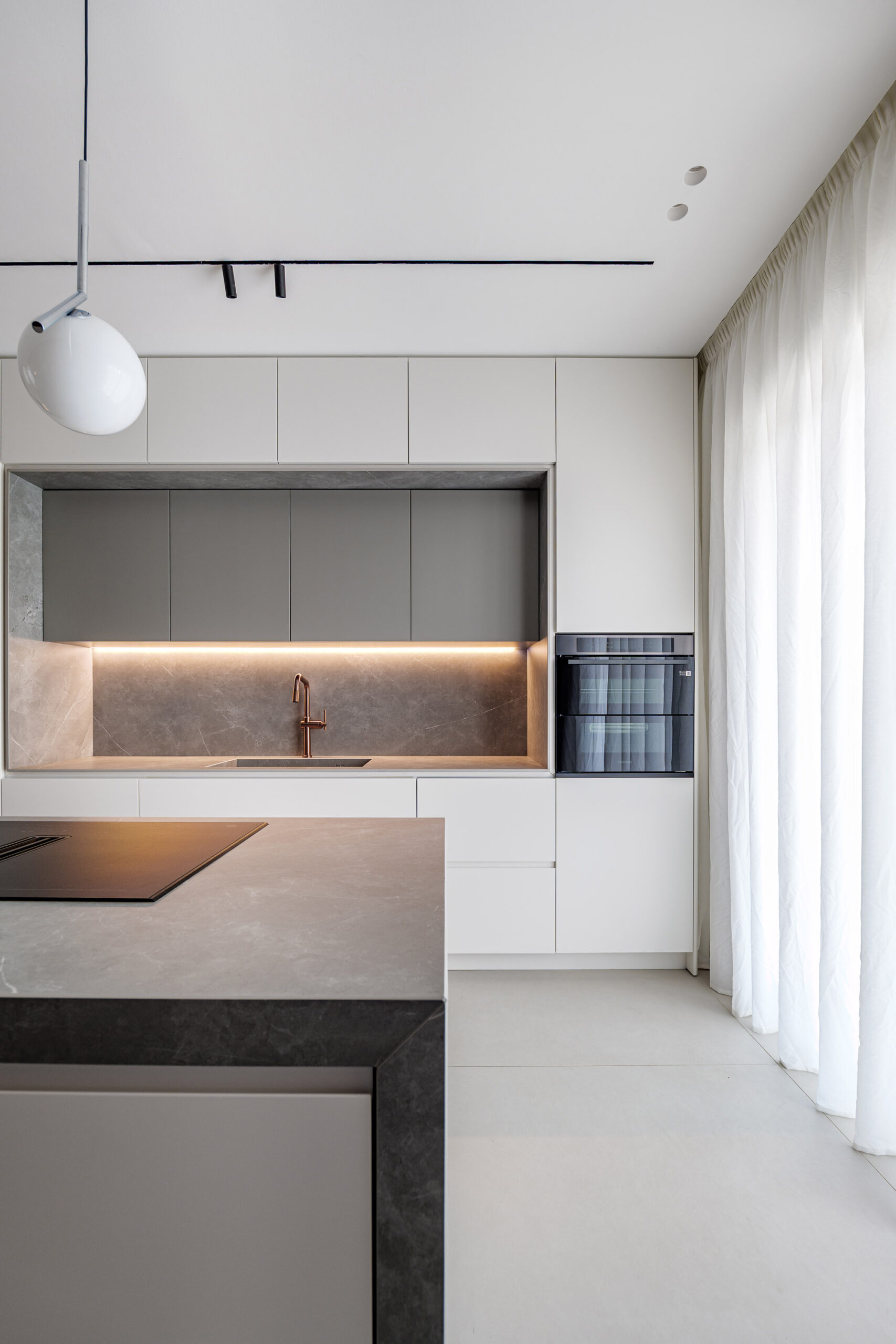 This project is based on a warm palette with shades reminiscent of earth tones: dark wood, beige, leather, and light gray stone. Design elements like mirrors are used to add a touch of luxury and depth to the space, while wooden panels not only add warmth but also serve as intelligent and decorative dividers that encompass all rooms of the apartment. This mix of materials and meticulously planned measures to create a cozy and sophisticated environment.