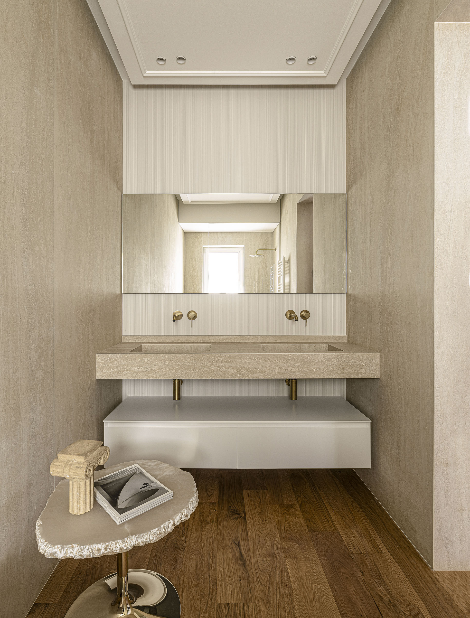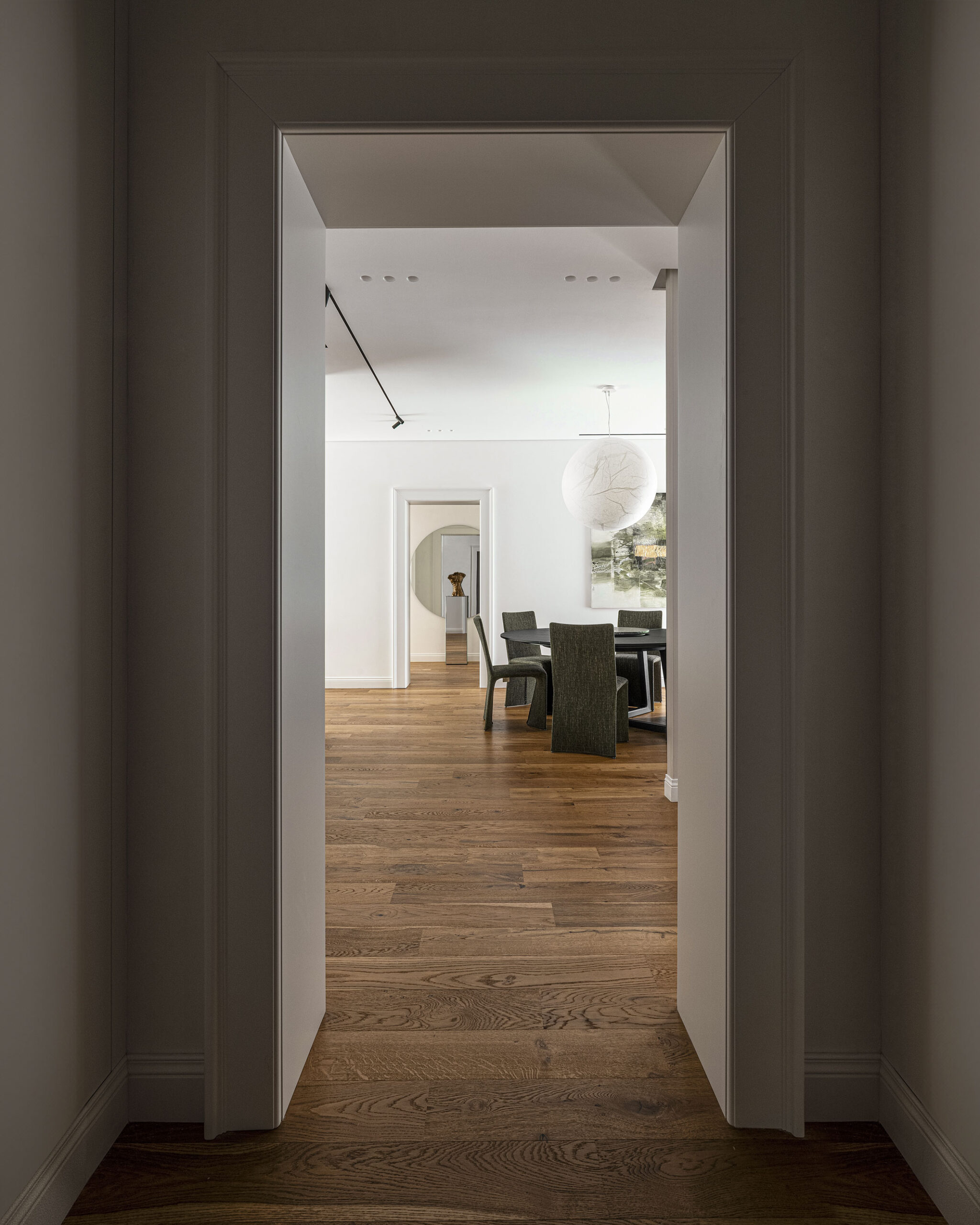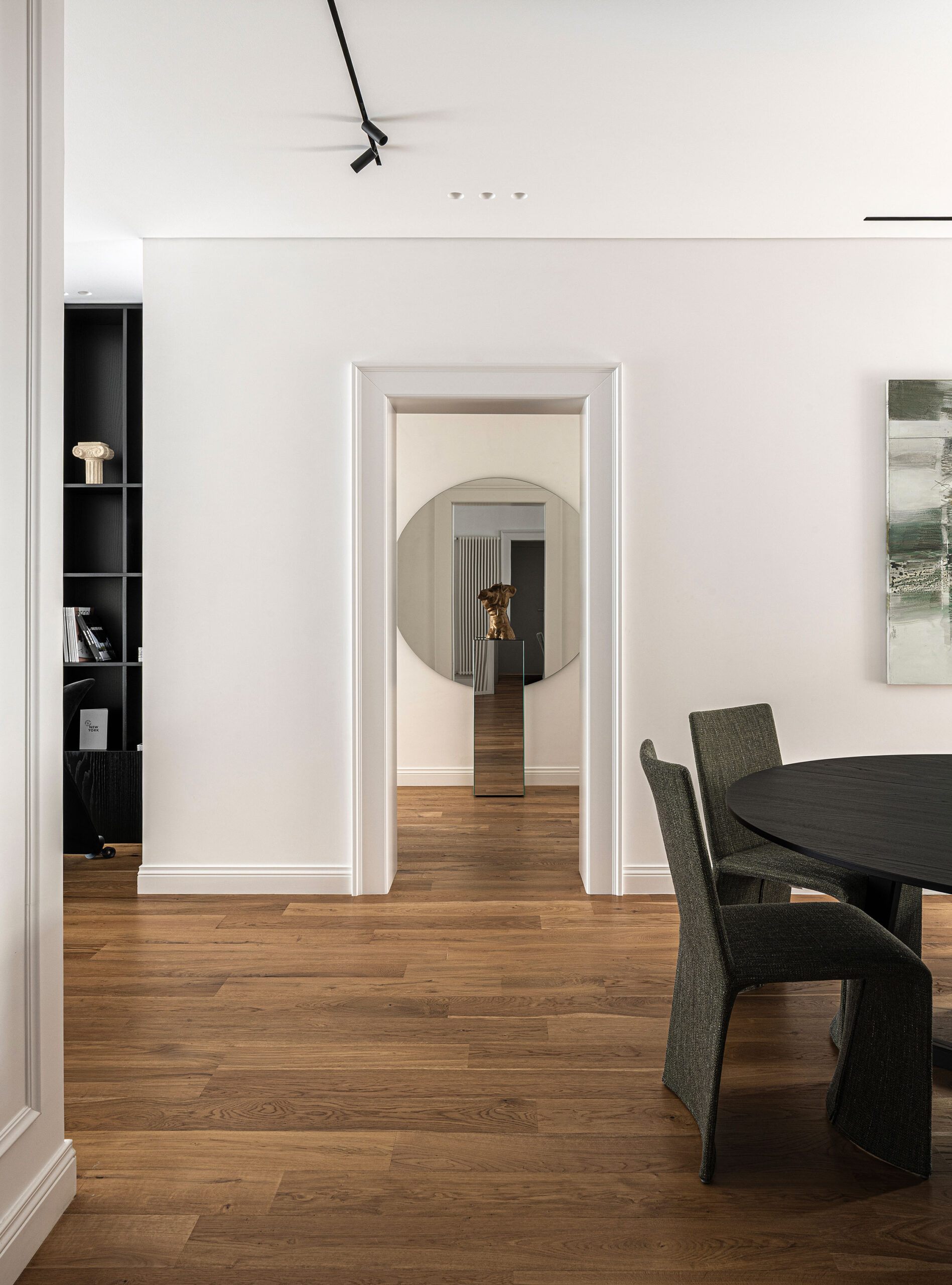 The project “THE ART SEPTUM” blends art and design in a symphony of elegance and aesthetic exploration. The goal is to create harmonious and fluid spaces where every element is meticulously studied to achieve perfect balance. Green Lepanto marble, light beige fabrics, and light oak parquet blend with black-stained oak wood, smoked mirrors, and white walls, accentuated by natural light filtering gently through the windows.
