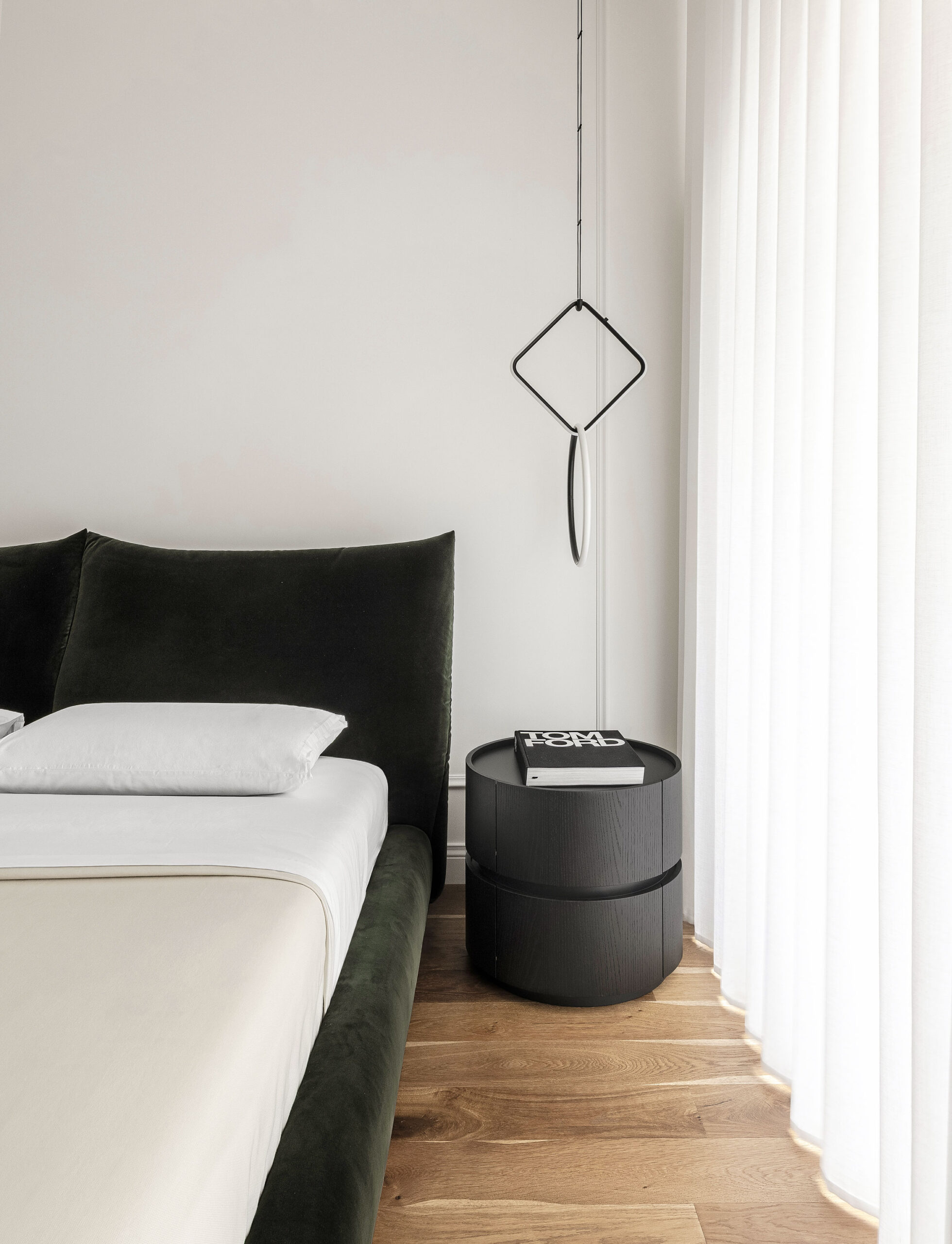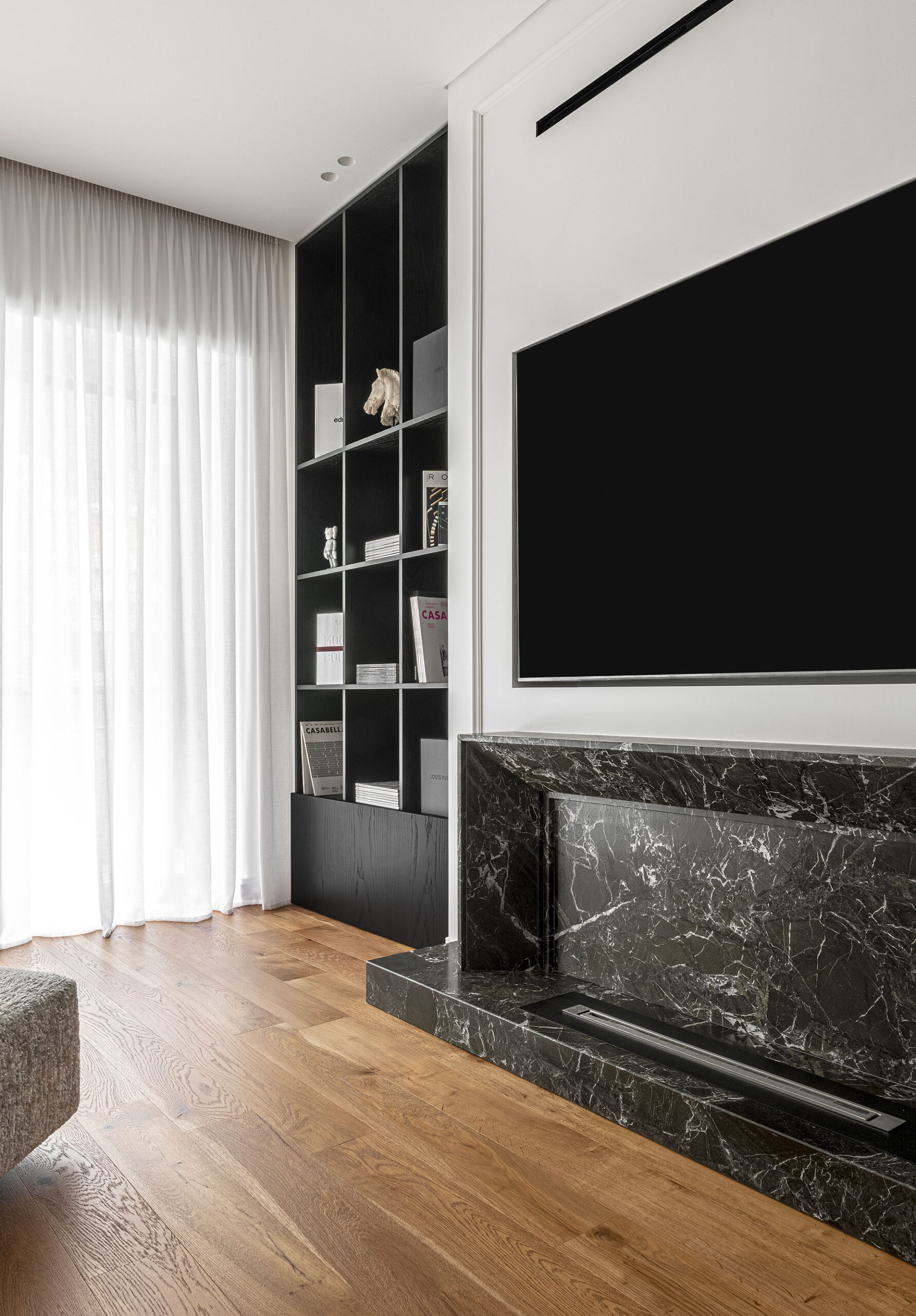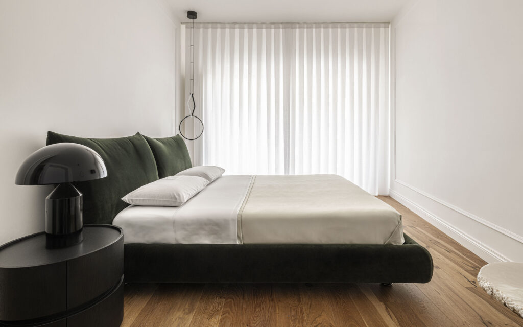 The project “THE ART SEPTUM” blends art and design in a symphony of elegance and aesthetic exploration. The goal is to create harmonious and fluid spaces where every element is meticulously studied to achieve perfect balance. Green Lepanto marble, light beige fabrics, and light oak parquet blend with black-stained oak wood, smoked mirrors, and white walls, accentuated by natural light filtering gently through the windows.