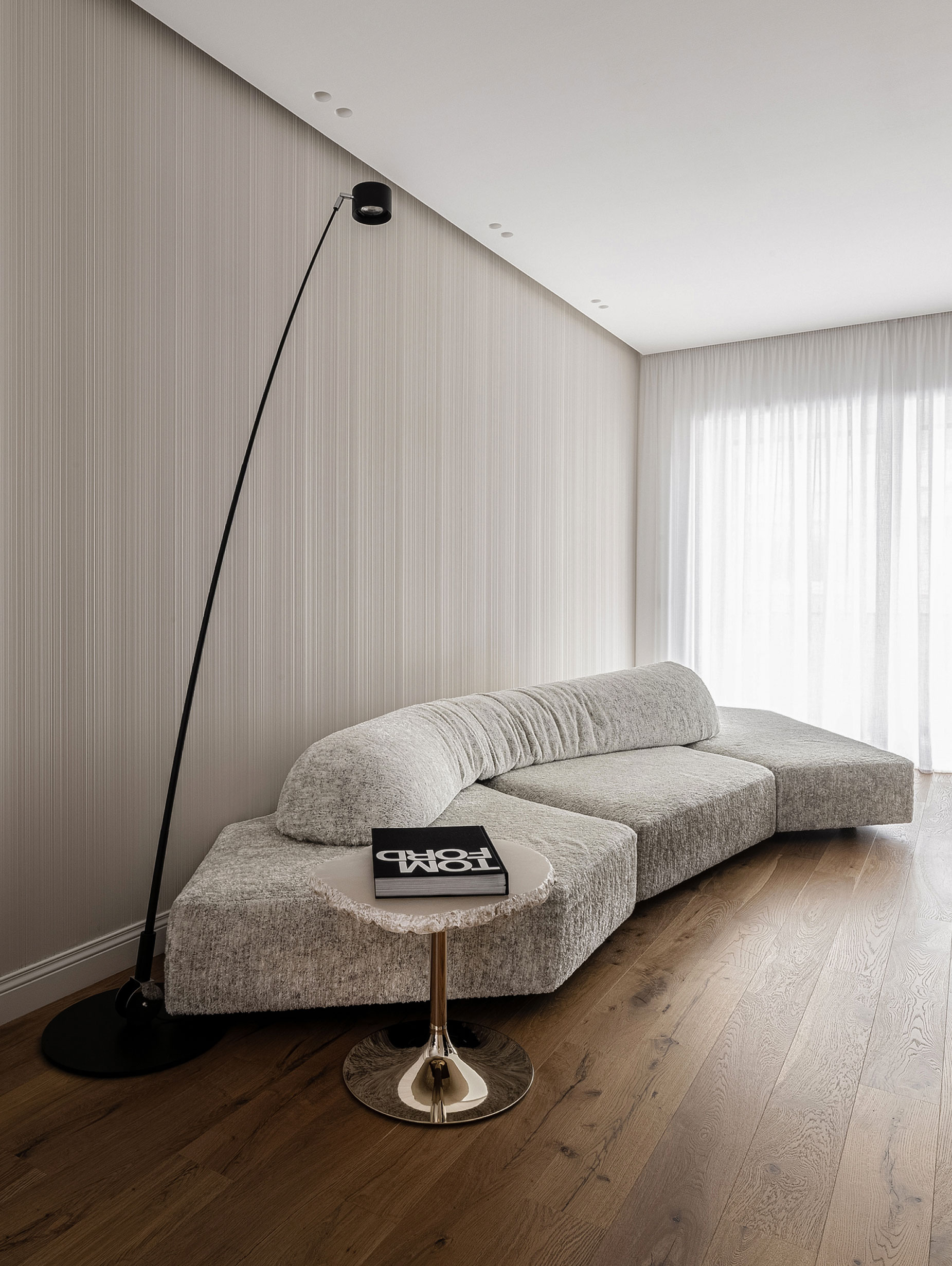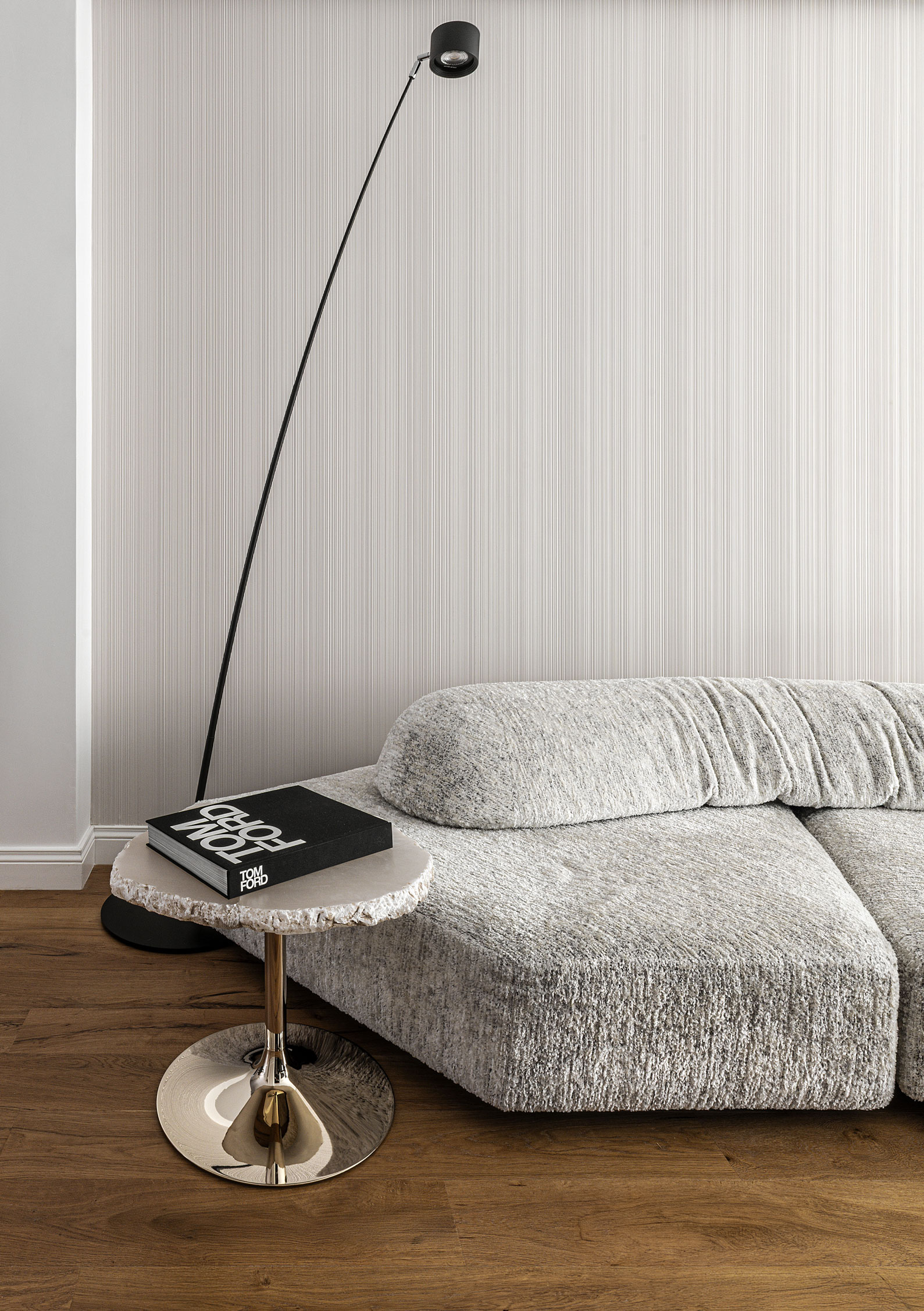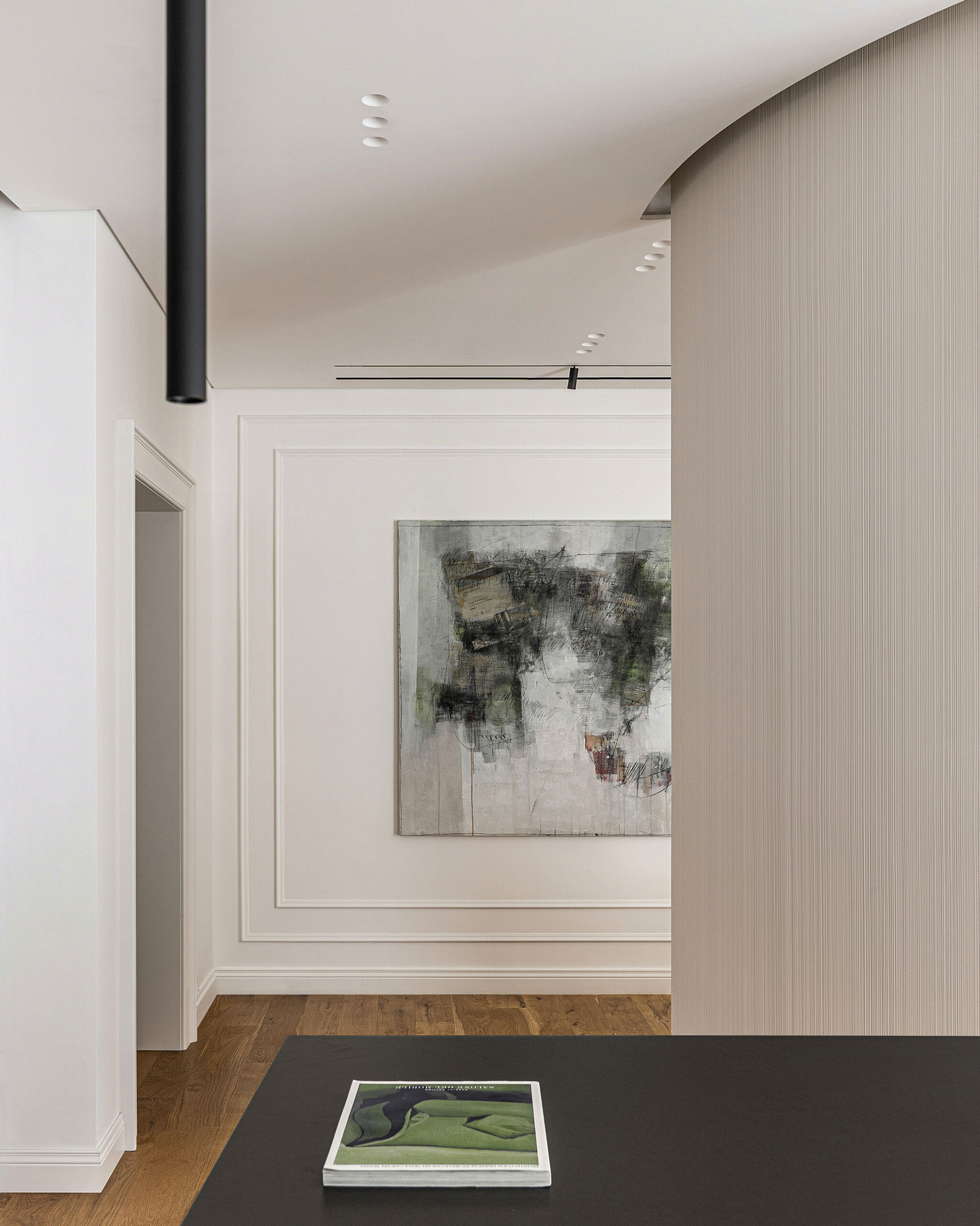 This project was born from the idea of creating a dialogue between the two main areas of the living space through an artistic element: a curved partition wall, conceived not only as a functional divider but as a true visual and symbolic centerpiece of the entire apartment. This rounded feature separates yet simultaneously connects the kitchen and the living room, enabling a smooth and harmonious transition between the two areas. It enhances the perception of space and fosters a sense of visual and aesthetic continuity.
