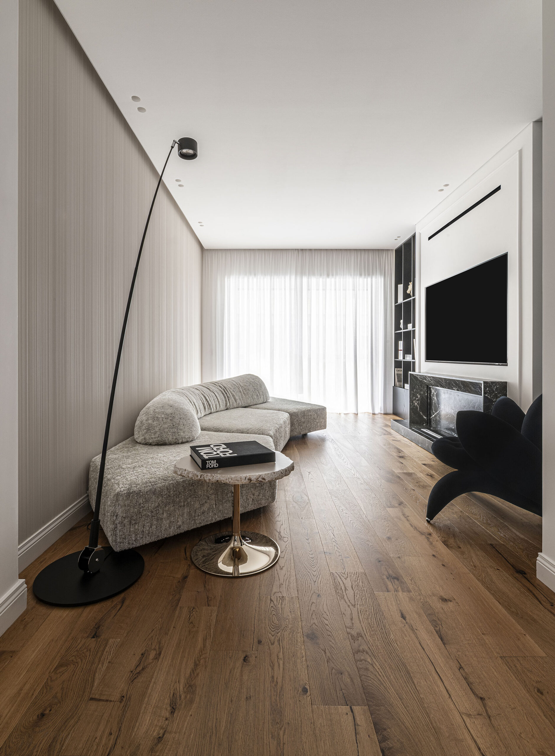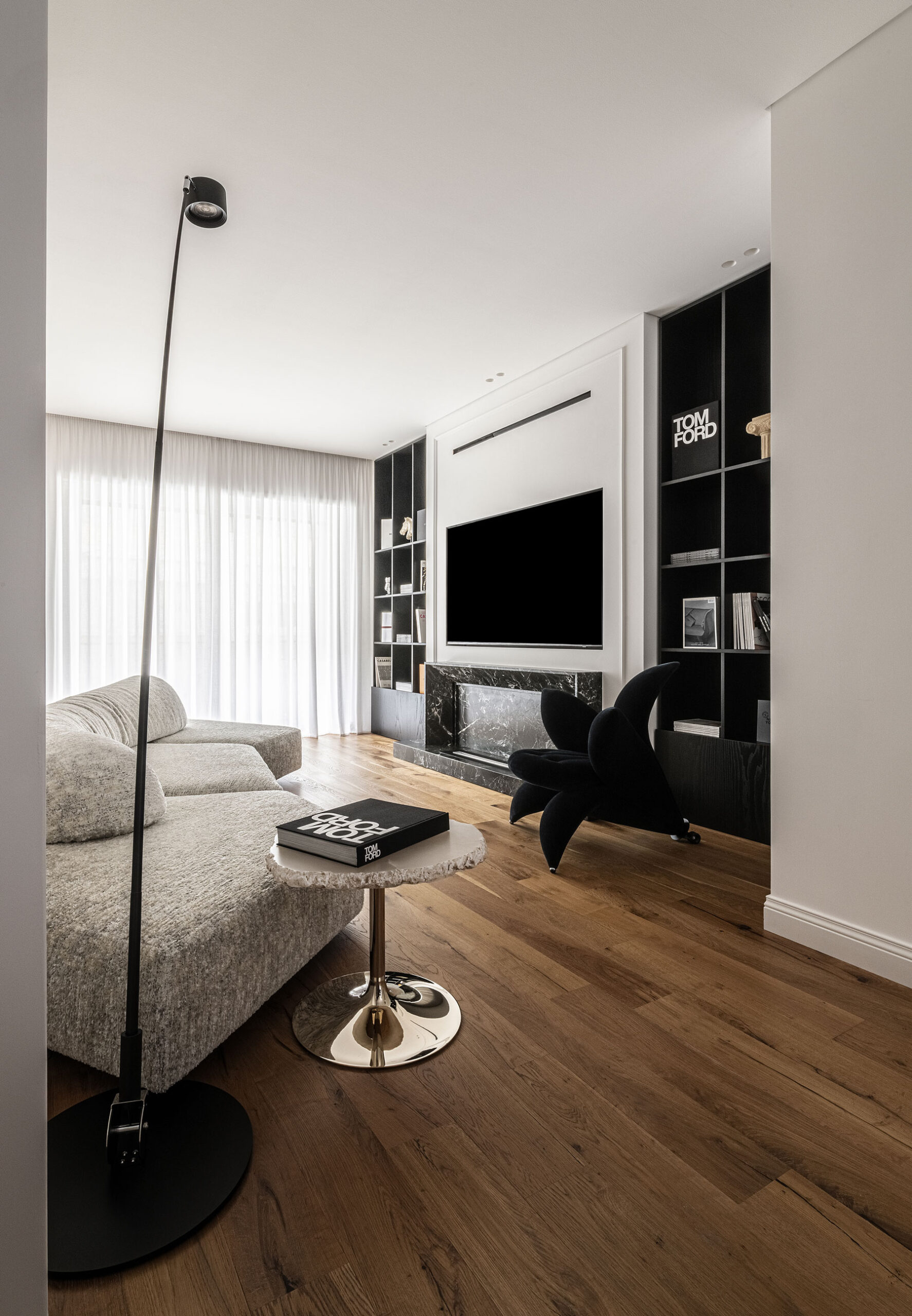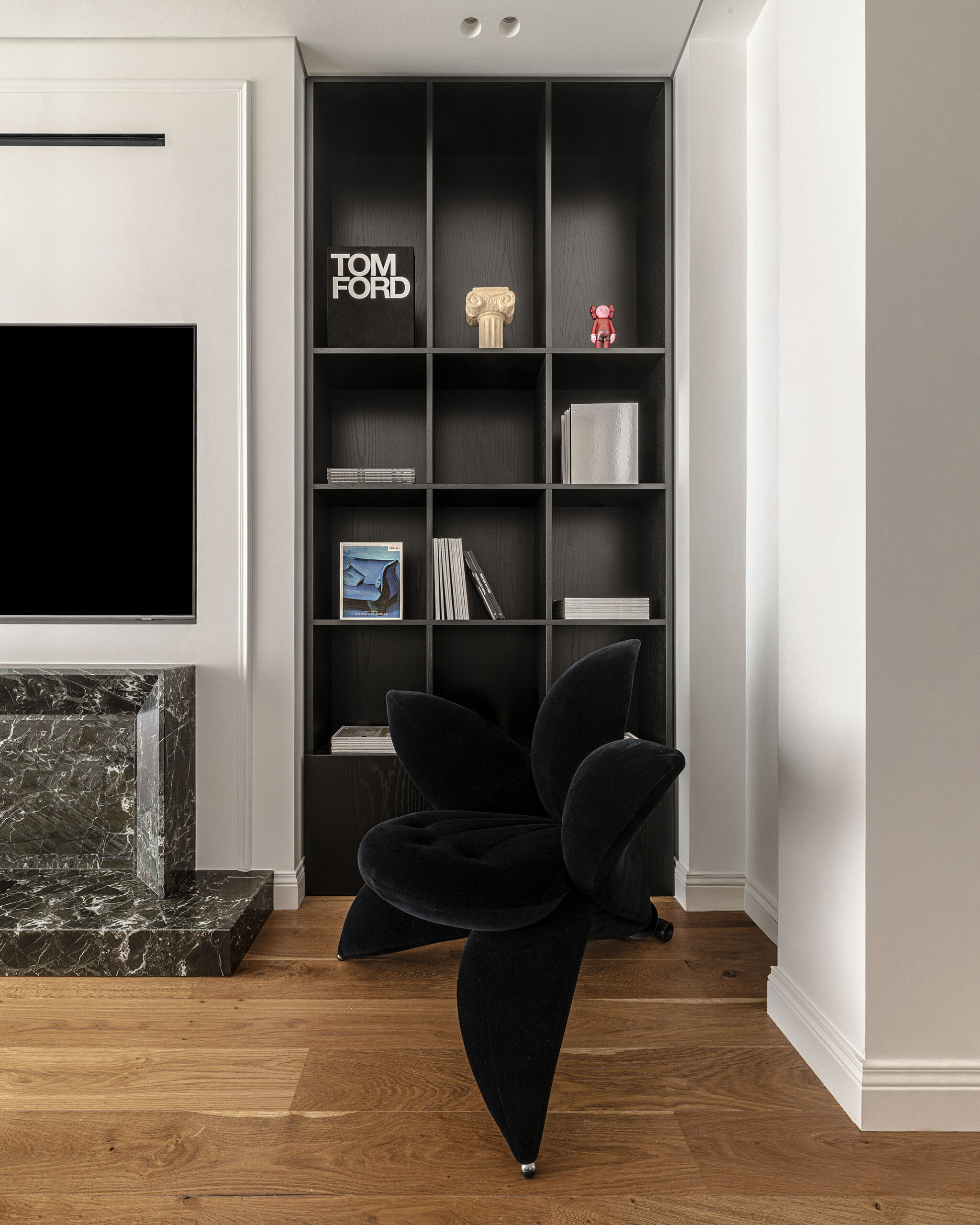 This project was born from the idea of creating a dialogue between the two main areas of the living space through an artistic element: a curved partition wall, conceived not only as a functional divider but as a true visual and symbolic centerpiece of the entire apartment. This rounded feature separates yet simultaneously connects the kitchen and the living room, enabling a smooth and harmonious transition between the two areas. It enhances the perception of space and fosters a sense of visual and aesthetic continuity.