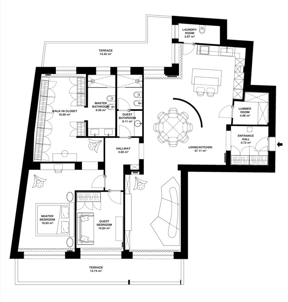 The master bedroom is designed as a high-end hotel suite: spacious, elegant, and inviting, it is intended to offer the utmost comfort and everyday luxury. Every detail—from the choice of materials to the layout of the furnishings—contributes to an intimate and relaxing atmosphere, perfect for refined, uncompromising living.